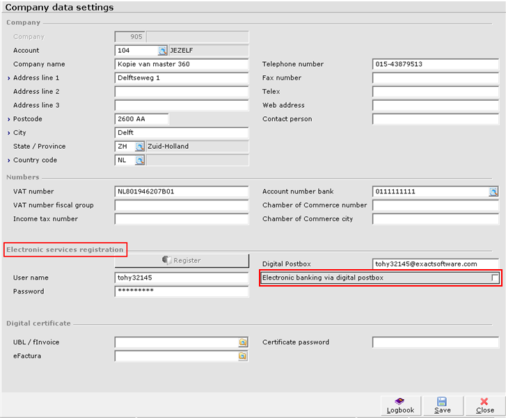 Note: The login information in User name, Password, and Digital Postbox are applicable for both electronic invoicing and automatic exchange of Rabobank’s bank files in the case of Dutch legislation only. In the case of Belgium legislation, the setting name change is applicable also. However, in such case, this setting is valid for the electronic invoice functionality only.