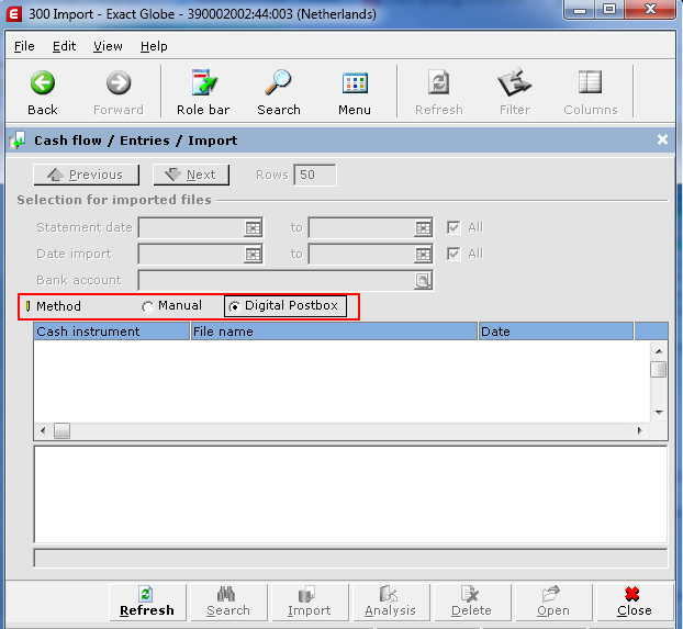 Method will still be available when none of the Rabobank cash instruments in your administration has the Transactions bank link. This is so that you can still trigger the bank links replication by refreshing the import screen under Digital postbox option. This scenario occurs when the bank link displayed in Exact Globe is “û”, while the bank link defined for Rabobank is “ü”.