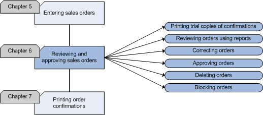 This chapter describes the process of reviewing and correcting and approving sales orders. The flowchart explains the steps in the process and the accompanying functionality in Exact Financials.