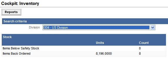 The Inventory Cockpit shows the number of items below safety stock (Count column) and the number of units that are below the safety stock level (Units column). It also shows the number of items that have a back order quantity (Count column) and the number of units that are backordered (Unit column). Change the division, if you have more than one, to see this information for the other division.