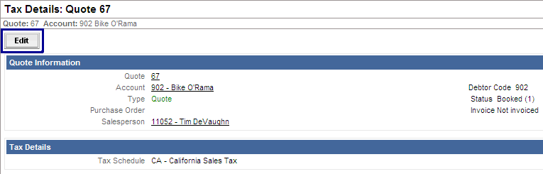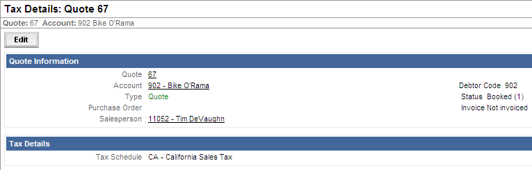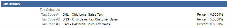 The Taxes Details page shows the tax schedule or tax detail codes with the percents of each on the quote or order.