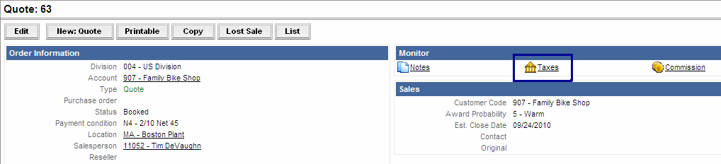 - On the Quotes or Orders page, in the Monitor section, click the Taxes link.