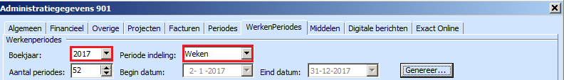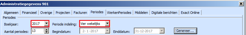 Let op: Indien er gewerkt wordt met de koppeling tussen Exact Globe/Compact en Exact AEC dan is het van belang dat de periodes binnen Exact AEC overeenkomen met de periode datumtabel van Exact Globe/Compact.