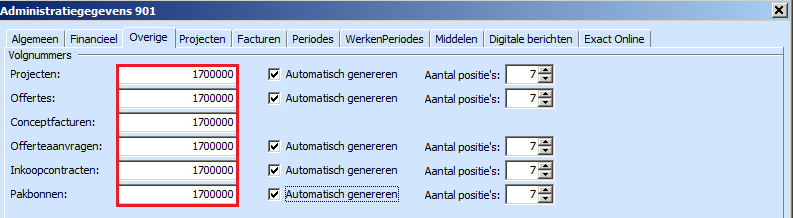 De verschillende volgnummers voor het nieuwe boekjaar kunnen eventueel worden gewijzigd en aangepast via de administratie instellingen onder het tabblad 'Overige'.