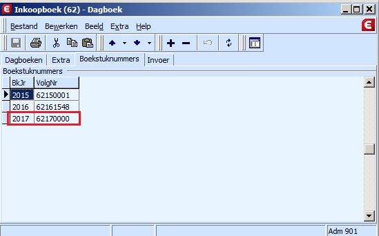 Ga vervolgens naar het tabblad Boekstuknummers, er wordt nu automatisch een nieuwe regel toegevoegd met daarin een boekstuknummer, dit boekstuknummer kunt u hierna aanpassen. Het boekstuknummer mag niet langer zijn dan 8 posities en dient voor Exact een uniek nummer te zijn over de verschillende boekjaren heen. Het is dus aan te bevelen om het boekjaar in het boekstuknummer op te nemen. Als opbouw adviseren wij u te beginnen met het boekjaar dan dagboeknummer en 4 posities voor het werkelijke boekstuknummer, v.b. 60160000 zoals hieronder staat aangegeven: