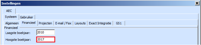 Op het tabblad Financieel onder het tabblad AEC in de systeeminstellingen dient het hoogste boekjaar op het nieuwe jaar gezet te worden. Verlaat vervolgens het instellingenscherm met de knop OK.