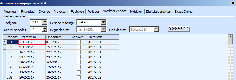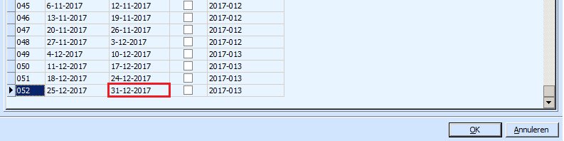 Klanten passen de tabel aan en laten hem starten op 01-01-2017 waardoor de eerste 4 weken periode iets langer is. De einddatum van een periode altijd een zondag.