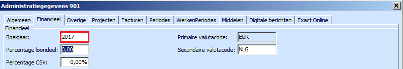 Nu het boekjaar 2017 is aangemaakt in de systeeminstellingen is het van belang dat het boekjaar wordt ingegeven in de administratie instellingen, zodat de nummers en periodes voor het betreffende boekjaar ingericht kunnen gaan worden. Dit dient voor alle administraties afzonderlijk te worden uitgevoerd.