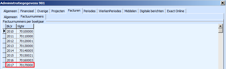Onder het tabblad Facturen en dan Factuurnummers in de administratie instellingen dient het nieuwe factuurvolgnummer voor het nieuwe boekjaar ingevuld te worden. Ga daarvoor op het hoogst aanwezige boekjaar staan en druk op het toetsenbord op de pijl naar beneden, er wordt nu een nieuwe regel aangemaakt waarin het boekjaar en factuurvolgnummer ingevuld kan worden. Het factuurvolgnummer mag niet langer zijn dan 8 posities en dient voor Exact uniek te zijn over de verschillende boekjaren heen. Het is dus aan te bevelen om het boekjaar in het factuurnummer op te nemen. Zoals hieronder staat aangegeven: