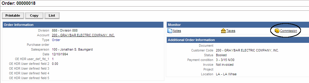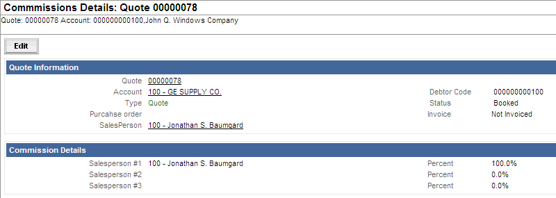 The Commissions Details page shows the commission breakdown for one to three sales people on a quote. The page has links to the quote, the customer account, and the salesperson. To see the commissions on a quote, open the Orders page; in the Monitor section, click the Commissions link.