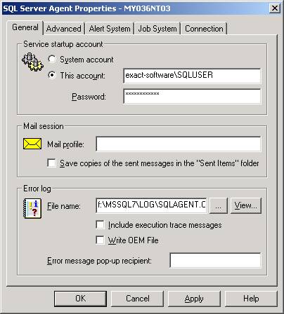 Application-defined or object-defined error or Object variable or with block variable not set — This error message may be displayed when the user running the SQL Server agent is not a domain administrator or a local administrator. The user running the SQL Server Agent must be a valid user in the Exact Synergy Enterprise database with the administrator role and have the administrator rights on the server or in the domain.
