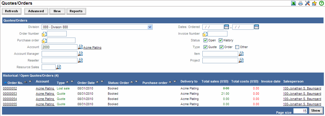 The Quotes/Orders page is an interactive view of the open and historical quotes and orders. Use this to view activity at a glance. This is the page linked to the Customer Card and the Item Card from the Orders link in the Monitor Section.