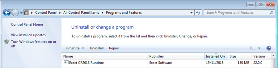 After the update, the new Crystal Reports Runtime component Exact CR2016 Runtime will be displayed in the Windows Control Panel.