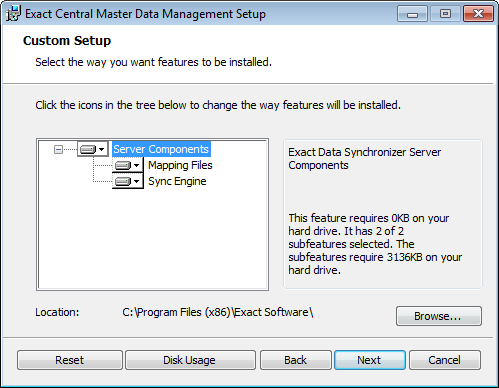 In het volgende scherm kunt u de te installeren onderdelen en de installatie locatie aangeven. De server componenten dienen te worden geïnstalleerd op de Exact Globe Next server. Standaard wordt de exact software directory (c:\Program Files\Exact Software of c:\Program Files (x86)\Exact Software op een 64bit besturingssysteem) voorgesteld. Het is niet noodzakelijk om deze in de installatie directory van Exact Globe Next te installeren, maar dit wordt wel geadviseerd.