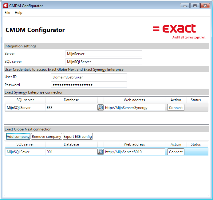 - User ID: Deze gebruikers wordt gebruikt om verbinding te maken met Exact Globe Next en Exact Synergy Enterprise. Deze gebruiker dient administrator te zijn in zowel Exact Globe Next als Exact Synergy Enterprise.