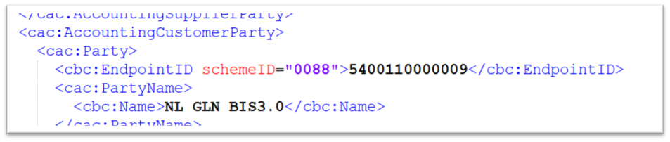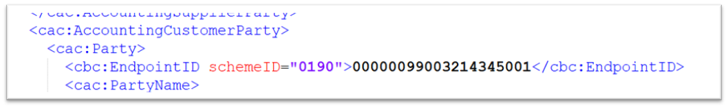 Als je de velden Type E-facturatie-identificatie en E-facturatie-identificator hebt gedefinieerd in het onderhoudscherm van debiteuren, gebruikt het systeem deze identificator om de ondersteunde formaten van de factuurontvanger te controleren bij het valideren van de factuurontvanger. De identificator wordt gebruikt in de xml-bestandstag wanneer de volgende opties zijn geselecteerd: