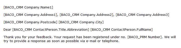 To create a personalized response message, you must first create the message with the CRM tags as reference to the original message at Documents à Setup à Layouts à Mail merge. When the response message is generated using this mail merge layout, the system inserts the relevant information according to the special tags. On the Layouts: Mail merge page, click New, and then define the fields. Under the mail merge layout editor section, type the response message and insert the CRM tags, for example [BACO_CRM ContactPerson.FullName] to reference the name of the contact person. Click Help to display the list of CRM tags. For more information on creating mail merge layouts, see Creating and modifying mail merge layouts.