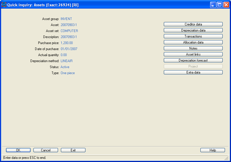 In the screen that appears, you can find detailed information regarding the fixed asset. By using the buttons, you can retrieve even more detailed information.