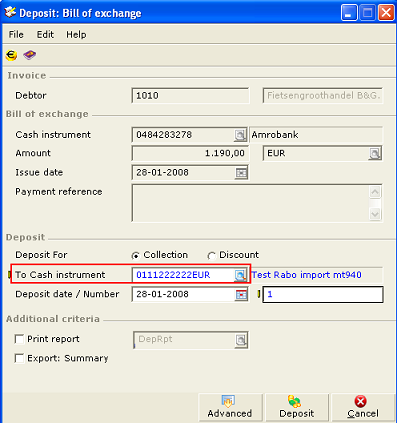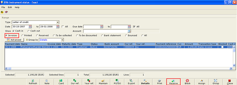 4. Under option 'Received', select the invoice and press the Deposit button. Deposit into the Cash instrument 01112222222EUR.