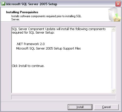 On the Installation Prerequisite page, Setup installs software required for SQL Server 2005. For more information about component requirements, click the Help button at the bottom of the page. To begin the component update process, click Install. To continue after the update completes, click Finish.