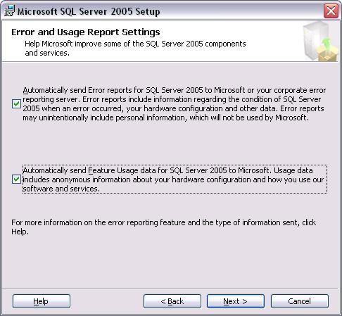 On the Error Reporting page, optionally clear the check box to disable error reporting. For more information about error reporting functionality, click Help at the bottom of the page. To proceed, click Next.