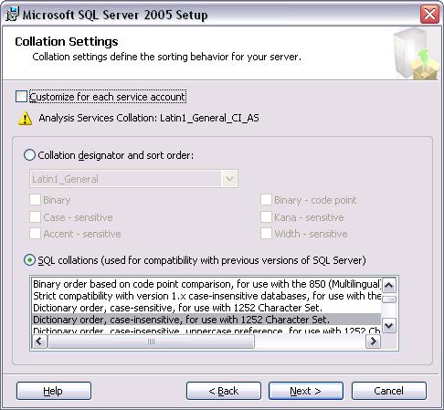 On the Collation Settings page, specify the collation for your SQL Server instance. You can use one account for SQL Server and Analysis Services, or you can specify collations for individual components. To set separate collation settings for SQL Server and Analysis Services, select the Customize for each service account check box. After you select the check box, a drop-down selection box appears. Select a service from the drop-down selection box and then assign its collation. Repeat for each service. To proceed, click Next. In this example,the default Collation which follows the regional setting is chosen.
