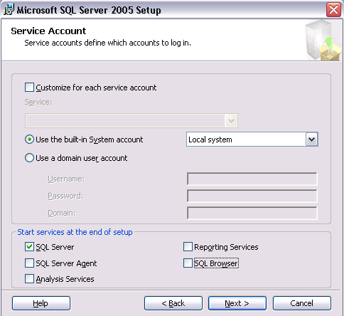 On the Service Account page, specify the user name, password, and domain name for SQL Server service accounts. You can use one account for all of the services. Optionally, you can specify an individual account for each service. To specify an individual account for each service, select Customize for each service account, select a service name from the drop-down box, and then provide login credentials for the service. To proceed, click Next.