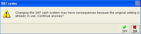 The warning message for select or clearing the VAT cash system check box - "Changing the VAT cash system may have consequences because the original setting is already in use. Continue anyway?"