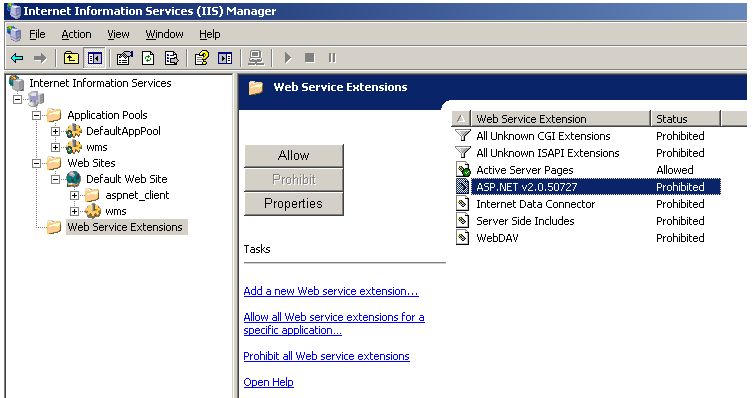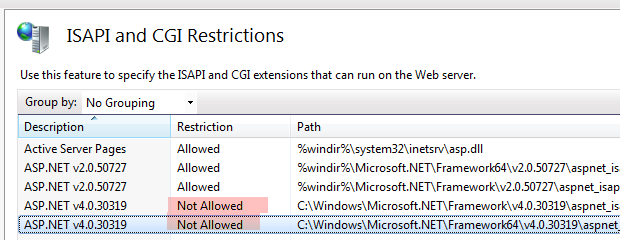 v.2.0.50757' is set to 'Allowed'. From release 411, ASP.NET v.4.* needs to