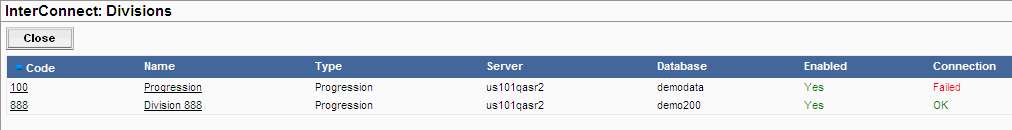 The InterConnect: Divisions page shows a list of the back office companies used in InterConnect.
