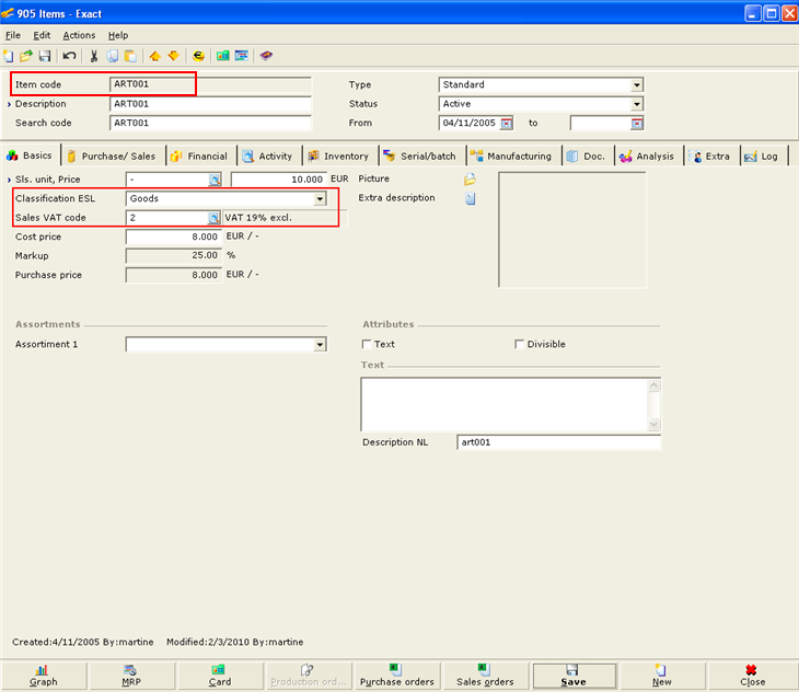 When the option at Classification ESL is Services, the VAT code will be based on VAT services in the debtor maintenance screen. However, if VAT services is empty (NULL), then the VAT code will be based on VAT. If both VAT services and VAT in the debtor maintenance screen are empty (NULL), then the VAT code will be based on Sales VAT code in the item maintenance screen.