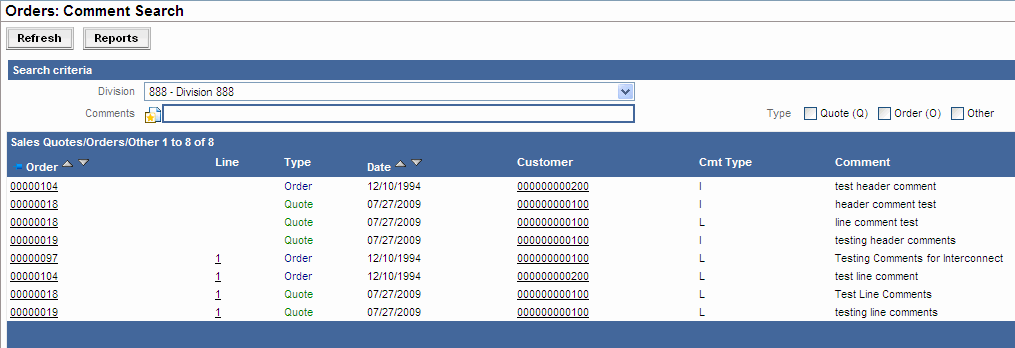 Use the Orders: Comment Search page to search through the comments added to orders and quotes.