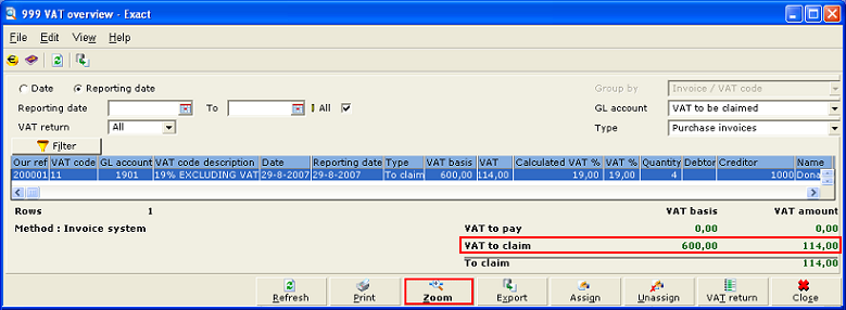 2. Click Zoom. In the VAT to be claimed GL account view, the user will see that "2007-08" is filled under the Return period column, while the Date and Reporting date columns for the offset entry are filled with "31-08-2007".