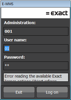 When starting E-WMS on a scanner, following error occurs: "Error reading the available Exact License options. Object reference not set to an instance of an object":
